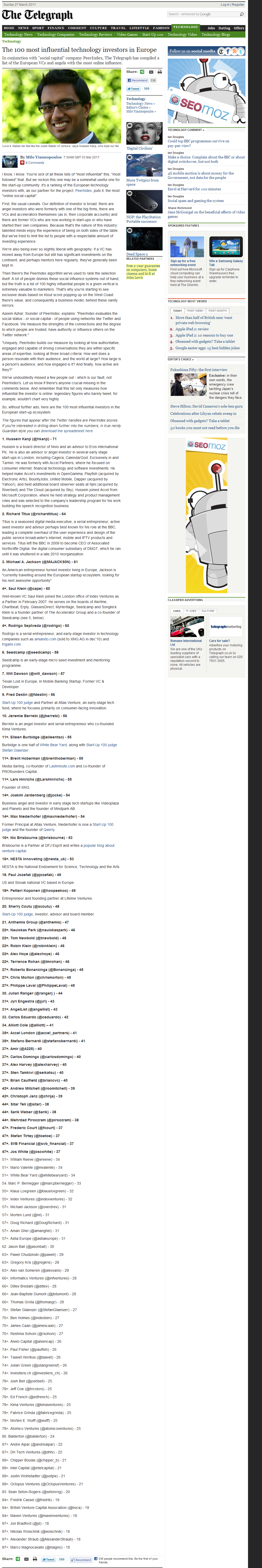 Die britische Tageszeitung Telegraph hat im März 2011 eine Liste der einflussreichsten Tech-Investoren in Europa herausgegeben. Die Erhebung fand auf Basis von Twitterdaten statt. Hier eine Kopie des Artikels, falls er nicht mehr online sein sollte.
